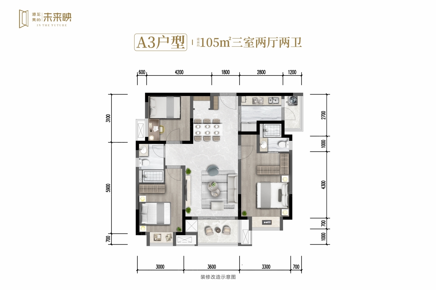 A3户型 3室2厅1厨2卫 105.00㎡